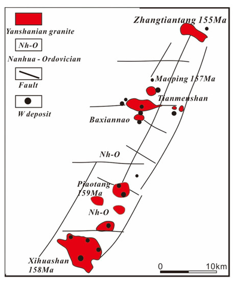 - Chen, J.; Wang, R.C.; Zhu, J.C.; Lu, J.J.; Ma, D.S. Multiple-aged granitoids and related tungsten-tin mineralization in the Nanling Range, South China. Sci. China-Earth Sci. 2013, 56, 2045–2055. [Google Scholar] [CrossRef]