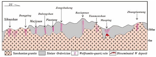 Geological profile of the Xihuashan-Zhangtiantang region of South China. Note that all wolframite-bearing quartz veins of economic value are located at similar specific horizontal elevations and intervals (modified after [172]).
