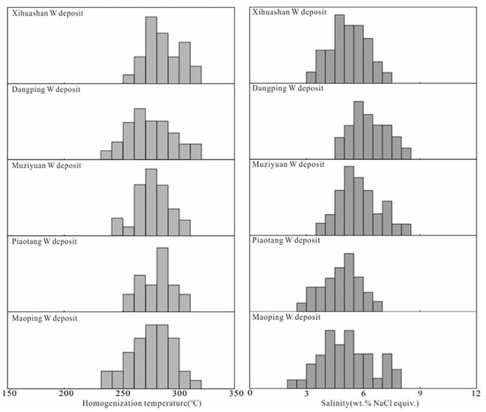 Histograms of homogenization temperatures (Th) and salinities for fluid inclusions from the different tungsten deposits in the Xihuashan-Zhangtiantang region.