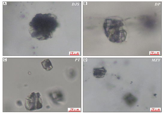 Melt inclusions trapped in quartz from granite. Typical melt inclusions from the Dajishan (A), Dangping (B), Piaotang (C) and Muziyuan (D) tungsten deposits in South China. Abbreviations: DJS—Dajishan; DP—Dangping; PT—Piaotang; MZY—Muziyuan.