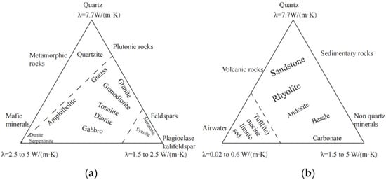 The characteristics of the rock itself are influenced by its mineral composition and mineral content. Some scholars have carried out much research on the influence of mineral composition on rock properties [,,,,]. Among them, the research on the relationship between the thermal conductivity of rocks and minerals includes: Clauser and Huenges [] study on the relationship between different minerals and the thermal conductivity of rocks. Figure 1a shows the relationship between metamorphic rocks, intrusive rocks, and different mineral components. Figure 1b shows the relationship between volcanic rocks, sedimentary rocks, and different mineral compositions. For different rocks, the position in Figure 1 basically represents its thermal conductivity and shows the relationship between its composition and different minerals. Intrusive rocks such as granite are mainly composed of minerals such as quartz and feldspar, and the porosity of such rocks is generally small. Therefore, the thermal conductivity of this type of rock is mainly determined by its mineral composition. Fuchs and Förster [] calculated the thermal conductivity of rocks in the northern German basin based on the rocks’ mineral composition.