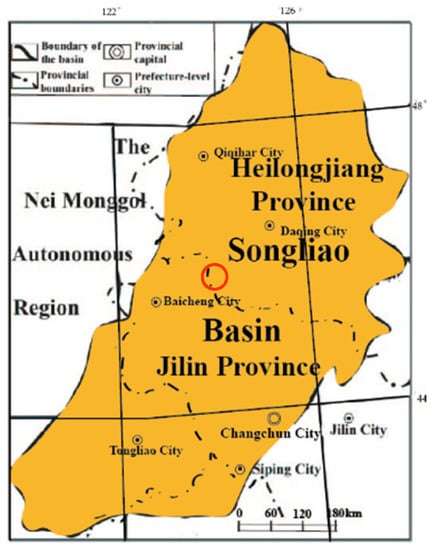 The Songliao Basin is located in the central part of Northeast China, straddling the Heilongjiang, Jilin, and Liaoning provinces, and the Inner Mongolia Autonomous Region (Figure 2). The specific location is 119°40′–128°24′ east longitude and 42°25′~49°23′ north latitude. The basin is distributed in the NNE direction, shaped like an irregular rhombus, with a length of about 750 km, a width of 330–370 km, and an area of about . Intrusive rocks such as granite and metamorphic rocks together form the base of the basin.