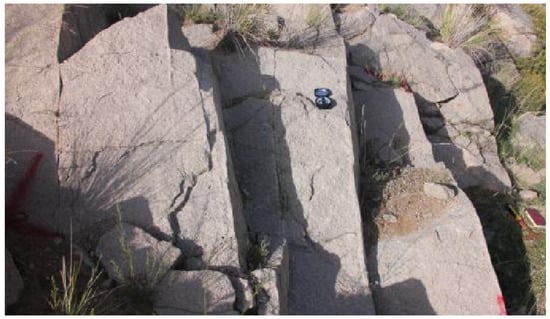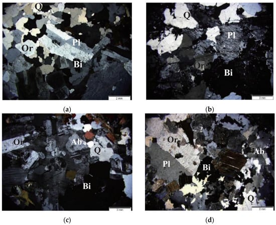 The color of granites in Songliao Basin and Gonghe Basin are yellow with pink or grayish-white. Granite is an acidic intrusive rock whose main components are quartz, feldspar, and mica. Granite has a semi-self-propelled granular or porphyritic structure and a massive structure. It is often produced in rock plants and foundations, and can often form well-developed mineral particles (Figure 7, Table 2) [].