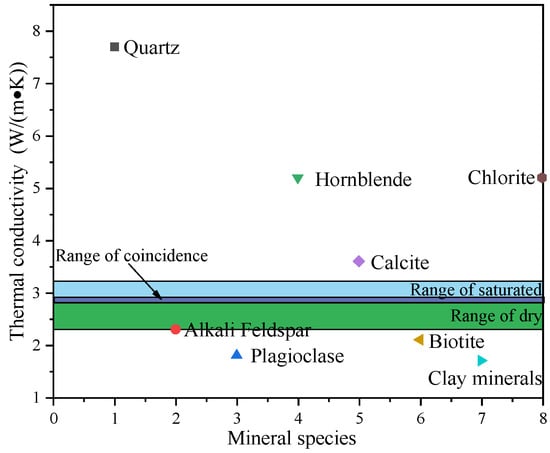 In this paper, a total of 30 rock samples from two regions were tested for their thermal conductivity. The variation range of all samples is 2.40–2.91 in the dry state and 2.82–3.16 in the saturated state. The variation range of thermal conductivity of granodiorite, syenite in Songliao Basin, and granodiorite in Gonghe Basin, respectively in the dry state is 2.70–2.90 , 2.40–2.60 , and 2.71–2.91 . The variation range, respectively in the saturated state is 2.85–2.95 , 3.00–3.16 , and 2.82–2.98 (Table 2). It can be seen that different types of rocks have different ranges of thermal conductivity, which is closely related to the mineral composition and structure of rocks. From the horizontal comparison, the range of thermal conductivity of granite in the same basin is relatively small. There are some samples with large variations of thermal conductivity. From the above mineral composition analysis, it can be seen that when the mineral content of the two rocks is not much different, the thermal conductivity is not much different. Conversely, the difference in thermal conductivity is large [,]. This is related to the mineral composition inside the rock, and it is also related to the pore size. In this paper, the thermal conductivity of main constituent minerals and the range of thermal conductivity of rock samples are collected (Figure 6).