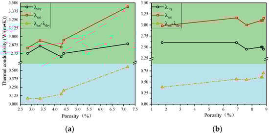 The laboratory test values of rock samples are classified according to the quartz content, and the variation of their thermal conductivity with porosity is investigated. When the quartz content is low (Figure 8a), − is between 0.068–0.515 . With the increase of porosity, the difference increases gradually. When the quartz content is high (Figure 8b), the difference is between 0.375 and 0.760 . The basically does not increase with porosity. increases with the porosity, but the range is much smaller than when the quartz content is small. It can be seen that the content of minerals such as quartz and porosity have different effects on the thermal conductivity of rocks. Therefore, in the calculation of and , the air and water in the pores cannot be calculated as a mineral-like composition with low thermal conductivity.