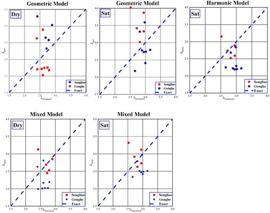 In the dry/saturated state, the comparison of Geometric Model, Harmonic Model, and Mixed Model shows that the distance between the sample points of Mixed Model and the line is more concentrated (Figure 9). The calculated value of the Mixed Model is close to the measured value. For the Mixed Model, comparing the measured and calculated thermal conductivity values, the difference between them is 0.46 on average and 0.73 on maximum. It can be seen that the calculation accuracy is significantly improved compared with the previous models (Figure 9).