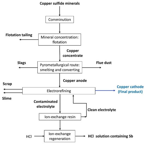 Lastly, the electrorefining stage aims at purifying the copper anode to generate the final copper product as a cathode. One of the major challenges in this process is controlling the concentration of metals in the tankhouse electrolyte that dissolve from the anode along with copper, such as arsenic, antimony, and bismuth. In general, the molar ratio of As/(Sb+Bi) is controlled and kept in a suitable range where Sb and Bi produce a minor effect. However, this increases health problems and the impurities are lost in the anode slime [30,31]. Antimony and bismuth are valuable metals widely used in semiconductor, thermoelectric, pharmaceuticals, chemicals, ceramics, and pigments, also being considered as critical elements by the European Commission [32,33]. Thus, extracting and recovering these metals from copper production has become increasingly important. In recent years, several methods have been tested for removing these impurities from tankhouse electrolytes, such as chemical precipitation [34,35], solvent extraction [36,37], using activated carbon [38,39], chemical leaching [40], electrodialysis [41], electrowinning [32], and ion-exchange resins [30,42]. Among these technologies, ion-exchange resins are used on industrial scale worldwide [30].
