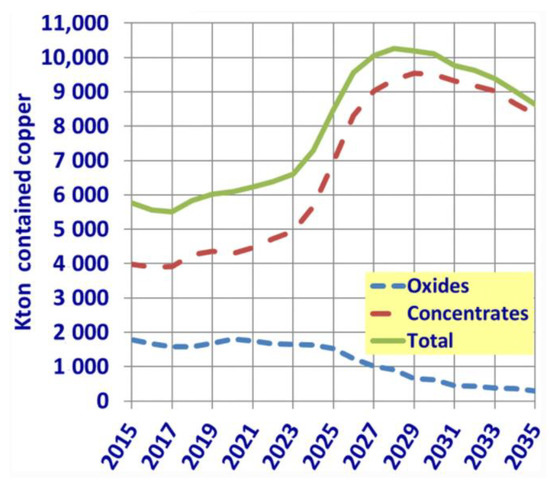 Projection of copper production in Chile in the coming years from oxide and sulfide (concentrate) ores (Adapted from [5] with permission).