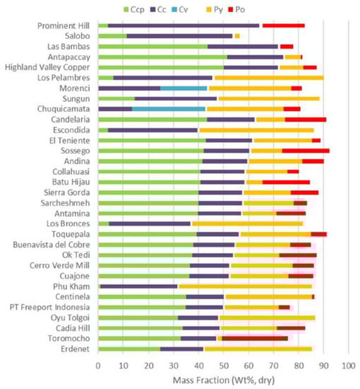 Mineralogical composition of copper concentrates from the world’s leading copper producers. Ccp, Cc, Cv, Py, and Po are chalcopyrite, chalcocite, covellite, pyrite, and pyrrhotite, respectively [77].