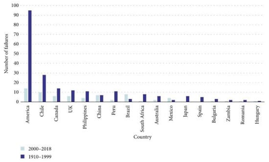 Number of accidents involving tailings dam failures in several countries from 1910 to 2018 [81].