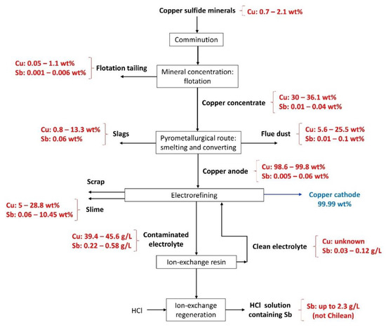 The mining industry has faced significant challenges to maintaining copper production technically, economically, and environmentally viable. Some of the major limitations that must be overcome in the coming years are the copper ore grade decline due to its intense exploitation, the increasing requirements for environmental protection, and the need to expand and construct new tailings dams. Furthermore, the risk of a supply crisis of critical metals, such as antimony and bismuth, has prompted efforts to increase their extraction from secondary resources in copper production. Therefore, improving conventional processes and developing new technologies is crucial to satisfying the world’s metal demands, while respecting the policies of environmental organizations. Hence, it is essential that the chemical composition of each copper production stage is known for conducting these studies, which may be challenging due to the huge variability of concentration data concerning the ore extraction region, the process type, and the operational conditions. This paper presents a review of chemical composition data of the main stages of copper production from sulfide minerals, such as (1) copper minerals, (2) flotation tailings, (3) flotation concentrates, (4) slags and (5) flue dust from the smelting/converting stage, (6) copper anodes, (7) anode slimes, (8) contaminated electrolytes from the electrorefining stage, (9) electrolytes cleaned by ion-exchange resins, and (10) elution solutions from the resins. In addition, the main contributions of recent works on copper production are summarized herein. This study is focused on production sites from Chile since it is responsible for almost one-third of the world’s copper production.