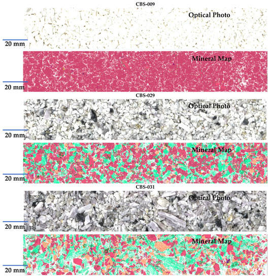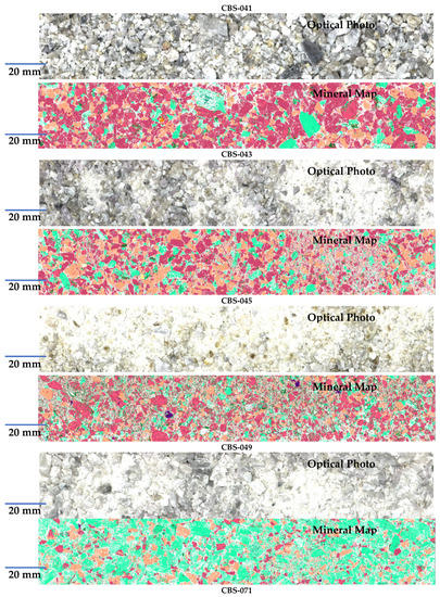 Figure 4 shows the optical photos and the mineral maps for a selection of eight samples of the calibration set. For each sample split into the above-described container, the top image is an optical high-resolution photo of the crushed ore whereas the image at the bottom represents the mineral distribution using the ten identified minerals. These minerals were used as input parameters to feed the artificial intelligence algorithm implemented in the ECORE analyzer in order to generate mineral mapping on the surface of the samples of the calibration set. For more details about this algorithm the interested reader is referred to references cited therein [21,22,23]. Furthermore, in Figure 4 one can observe that the crushed lithium ore under study is composed mainly of four minerals namely quartz, spodumene, albite and microcline and that the remaining minerals are in minor amounts. For instance, in the samples CBS-031 and CBS-045 a trace amount of bityite was detected, in the sample CBS-041 small areas of garnet were detected, in the samples CBS-031 and CBS-043 a small number of pixels were attributed to beryl, muscovite was almost detected in all the samples but in minor abundance.