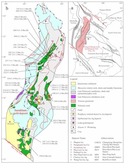Regional geological map. (a) Simplified tectonic map showing structural units of Laos andadjacent regions; (b) simplified geological map of the Luang Prabang–Loei metallogenic belt (geochronological data from [,,,,,,,,,,,,], modified from [,]). A = andesite; B = basalt; Br = breccia; D = dacite; Db = diabase; Dr = diorite; G = gabbro; Gd = Granodiorite; M = monzonite; R = rhyolite; T = tuff.