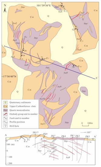 Compared with important gold deposits in the Luang Prabang–Loei metallogenic belt, the epithermal gold class can be excluded in Sanakham because there is neither continental volcanic rock exposure, nor characteristic kaolinite, alunite, or porous silicification. Even though quartz monzodiorite predominates in the wall rock, the hydrothermal metasomatic alteration, such as skarnization and horny alteration, has little spatial relation with gold mineralization, different from the regional representative porphyry-skarn copper–gold deposits [,]. Actually, the lode-gold orebodies in Sanakham are strictly controlled by the NE-NNE trending faults and crosscut the lithological interfaces between quartz monzodiorite and slate (Figure 2), which is similar to the Phapon epizonal orogenic gold deposit in the northern part of the Luang Prabang–Loei belt [,].