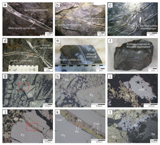 Typical alteration and mineralization in the Sanakham gold deposit (d–i are reflected light images). (a), Milky quartz–pyrite vein in quartz monzodiorite; (b), quartz–sulfide vein in quartz monzodiorite; (c), banded sulfide assemblages; (d), quartz—calcite vein crosscut quartz—sulfide vein; (e), coexistence of sulfides and quartz in hand sample; (f), sulfides occurred as massive aggregates; (g,h), stage I euhedral to subhedral coarse-grained pyrite and stage II subhedral to anhedral fine-grained pyrite and pyrrhotite; (i), stage II pyrite and pyrrhotite occurred around stage I arsenopyrite; (j,k), native gold coexisting with pyrrhotite or chalcopyrite that fills in fractures of pyrite; (l), sulfide aggregations in stage III. Apy, arsenopyrite; Au, native gold; Ccp, chalcopyrite; Gn, galena; Po, pyrrhotite; Py, pyrite.