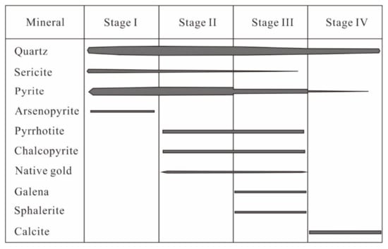 Stage I is normally quartz veins that comprise milky white quartz (Figure 3a), minor sericite, and euhedral to subhedral coarse-grained disseminated pyrite (Figure 3g) and arsenopyrite (Figure 3i). Stage II is characterized by quartz–sulfide veins and veinlets in grey color. The minerals are primarily subhedral to anhedral fine-grained pyrite, with minor pyrrhotite and chalcopyrite, which normally occurs around the boundary of stage I pyrite and arsenopyrite (Figure 3h,i). Native gold appears generally as irregular inclusions in pyrrhotite or chalcopyrite that fill in fractures of pyrite (Figure 3j,k). Similarly, stage III is characterized by quartz–sulfide veins and sulfide massive aggregations that consist of quartz, pyrite, pyrrhotite, chalcopyrite, and galena and sphalerite in particular (Figure 3l). They normally crosscut or overprint the stage II veins. Stage IV is characterized by quartz–calcite veinlets that crosscut the quartz–sulfide veins (Figure 3d).