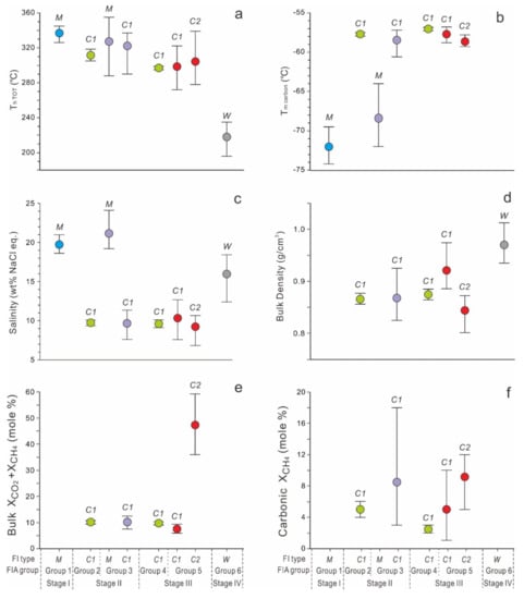 Ranges of Th TOT (a), Tm carbon (b), salinity (c), bulk density (d), bulk XCO2 + XCH4 (e), and carbonic XCH4 (f) versus Groups 1–6 FIA in the four stages, respectively. The points in the middle of the bars are the mean value.
