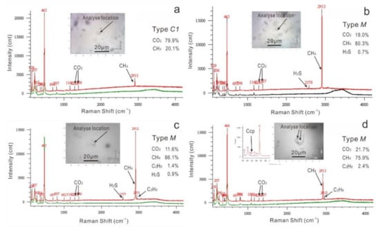Based on micro-observation, microthermometry and Laser Raman analyses, the fluid inclusions were classified and grouped according to textural criteria using the FIA (fluid inclusion assemblage) method [,]. Three gold-related primary fluid inclusion types were observed in quartz: type M, CH4-rich fluid inclusion; type C, CO2-rich fluid inclusion; and type W, aqueous inclusions. Type M inclusions normally comprise a carbonic vapor phase and an aqueous phase at room temperature (Figure 5a). The carbonic phase consists primarily of CH4, less of CO2, and occasionally of C2H6 and H2S, and separates into vapor and liquid carbonic phases through cooling (Figure 5b). These inclusions have a continuum V/(L + V) ratios range from 0.3 to 0.8 and homogenize to either liquid or vapor. Daughter minerals can be occasionally found in individual type M inclusions (Figure 5c). Type C inclusions contain two (aqueous + carbonic) or three (aqueous + liquid carbonic + vapor carbonic) phases at room temperature, and can be further divided into two subtypes based on their V/(L + V) ratios: type C1 has V/(L + V) ratios mostly between 0.1 and 0.3 and homogenizes into liquid (the aqueous phase, Figure 5d), whereas type C2 has V/(L + V) ratios of 0.6 and 0.9 and normally homogenizes into vapor (the carbonic phase, Figure 5e). The carbonic phase of type C inclusions consists of major CO2 and less CH4, which is different from type M inclusions. Type W aqueous inclusions comprise an aqueous phase and a vapor phase with V/(L + V) ratios of 0.05 to 0.25, and homogenize to liquid (Figure 5f). The type M and C inclusions are normally 5–15 μm in diameter, have predominately regular to negative crystal shape or partly irregular shape. The type W inclusions are relatively smaller (2–10 μm) and have regular to irregular shape.