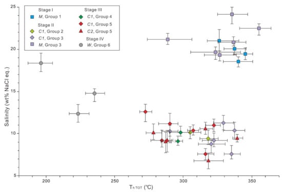 Six groups of FIA occur in hydrothermal quartz grains and are summarized in Table 1. Group 1 FIA consists of type M inclusions that show nearly constant V/(L + V) ratios, and widely distributed as clusters in stage I quartz (Figure 5g). Group 2 FIA, composed of C1 inclusions sharing the same composition, locally occurs as clusters in stage II quartz (Figure 5h). Group 3 FIA consists of M and C1 inclusions that widely occur as clusters in stage II quartz and show various volumes of the carbonic phases (Figure 5i). Group 4 FIA, also composed of C1 inclusions sharing the same composition, exists in stage III quartz, either as clusters, or along pseudo-secondary trails, or as isolated inclusions (Figure 5j). Group 5 FIA is distinctive and widespread in stage III quartz and consists of type C1 and C2 inclusions. The coexisting C1 and C2 inclusions have different V/(L + V) ratios and homogenize to liquid and vapor, respectively (Figure 5k,l). Group 6 FIA generally occurred in stage IV quartz and was comprised of W inclusions with identical V/(L + V) ratios (Figure 5m).