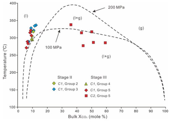 Homogenization temperature (Th TOT) versus calculated equivalent mole fraction CO2 of type C1 and C2 inclusions in stages II and III. The dashed curves delimit the two-phase regions of the H2O–CO2–NaCl system at 100 and 200 MPa, respectively. Data after Bowers and Helgeson (1983) []. g, gas; l, liquid.