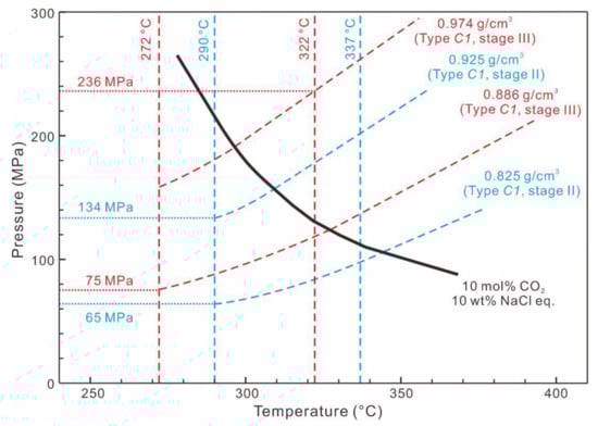 Estimated P-T conditions for the formation of the quartz veins in stages II and III in the Sanakham deposit. Representative isochores for mean bulk densities, respectively, for type C1 inclusions, and the solvus for H2O–CO2 fluids containing 10 wt% NaCl eq. and 10 mol% CO2 (calculated after reference []). The blue and red dashed lines define the range of Th TOT and bulk density of type C1 inclusions in Groups 3 and 5 FIA, respectively. The dotted lines represent the range of trapping pressures.