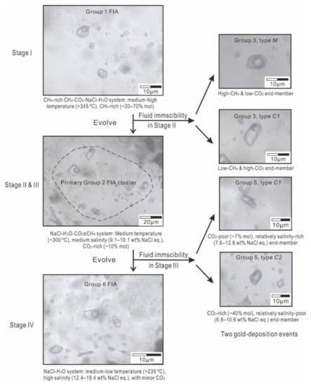 Except for Group 3 and 5 FIAs, which show evidence for fluid immiscibility, the homogenization temperatures of other primary fluid inclusions could only be regarded as the minimum temperature of entrapment. Combined with the above discussion, thus, the evolution of ore-forming fluids and related gold-deposition processes can be summarized below (as shown in Figure 11). The primary ore-forming fluids in stage I belonged to a CH4-rich CH4–CO2–NaCl–H2O system (Group 1 FIA), which is characterized by medium–high temperature (>345 °C) and a high content of CH4 (~20–70% mol). The first fluid immiscibility process occurred in stage II and is represented by two coexisting endmembers (Group 3 FIA) including both those with high-CH4 and low-CO2 and the opposite. The ore fluids gradually evolved into a NaCl–H2O–CO2 ± CH4 fluid (Group 2 FIA) with medium temperature (~300 °C), medium salinity (9.1–10.1 wt% NaCl eq.), and a high content of CO2 (~10% mol) during stages II and III. The second fluid immiscibility process occurred widely in stage III and therefore created two new coexisting endmembers (Group 5 FIA), which are the CO2-poor (~7% mol) and relatively salinity-rich (7.6–12.6 wt% NaCl eq.) ones, as well as the opposite. Due to the volatile loss caused by fluid unmixing, the ore fluids finally evolved into a medium–low temperature (>239 °C), medium–high salinity (12.4–18.4 wt% NaCl eq.) NaCl–H2O system in stage IV (Group 6 FIA) accompanied by simply cooling. The two important gold-deposition events were generated, respectively, along with fluid immiscibility processes during stages II and III mineralization.