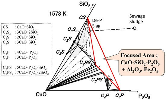 The composition of De-P slag and sewage sludge are projected on the ternary diagram. The composition of the mixture moves along the tie line, depending on the mixing ratio, and forms a triangular region comprising of apices CS, C3P, and C2S-C3Pss. Therefore, the phase relation in this region should be understood with particular interest on the separation of the P-concentrated solid phase. One can consider that CS and C2S-C3Pss would coexist by considering the aforementioned coexistence of CS and C3P. However, the influence on phase relation by other components involved with the mixing of De-P slag and sewage sludge are still unknown.