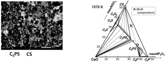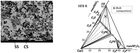 In recent operations of hot metal dephosphorization (De-P) in steel refining, the basicity ((mass%CaO)/(mass%SiO2)) of De-P slag has been found to be less than 1.5, as shown in Table 1. Previous mineralogical research on steelmaking slag has been mainly focused on a higher basicity [10,11,12,13,14,15,16]. If such De-P slag is considered as a phosphorus resource, the phase equilibria of the phosphorus-concentrated phase in the low basicity slag should be clarified [17].