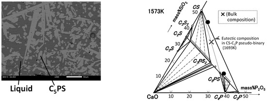 With respect to phosphorus recovery from such a multicomponent and multiphase system, it is necessary to make a pair of phases with a high and low phosphorus content. Considering this, the sufficient addition of Al2O3 or Fe2O3 as in the present system may be effective, so that phosphorus is concentrated into solid C5PS as a phosphorus-rich phase against the surrounding liquid phase with a low phosphorus content. Owing to such a simple structure, enlargement of phosphorus-rich phase would be advantageous to separate and recover them, based on controlling the crystal growth. Further research is in progress.