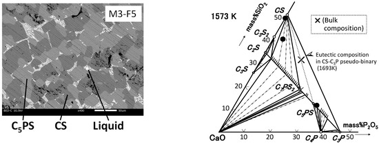SEM image of M3-F5 (5mass% Fe2O3) (left) and the phase composition projected on an isothermal section of the CaO-SiO2-P2O5 ternary phase diagram at 1573 K (right).