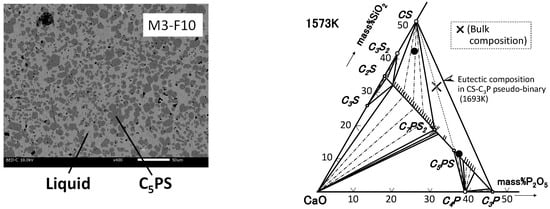 Figure 9, Figure 10 and Figure 11 show the SEM images of M3-F2, M3-F5, and M3-F10, respectively. The composition of each phase obtained with SEM-EDX is given in the same manner as for the Al2O3-containing sample in Table 5 and Figure 9, Figure 10 and Figure 11. For M3-F2 and M3-F5, three phases in different contrasts were observed. The phases corresponding to CS and C5PS still existed with the addition of Fe2O3 to M3–0 as a ternary sample, as well as in the case of Al2O3 addition. The third whitish phase lay in the gap of the abovementioned two solid phases and was identified as the liquid phase. The liquidus composition of M3-F2 almost lay on the tie line between CS and C5PS, and was close to CS compared to the bulk composition. The liquidus composition of M3-F5 was not on the tie line, but was still far from the eutectic composition in the system CS-C3P.