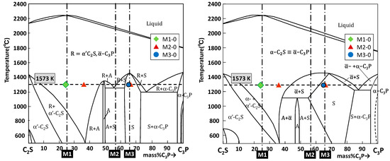 All the samples were separated into phases corresponding to CS and C2S-C3Pss. These results basically confirm that the compositional region focused on in this study was essentially saturated with CS as the almost P-free phase, and the solid solution as the P-concentrated phase. This finding would be advantageous for phosphorus recovery by phase separation.