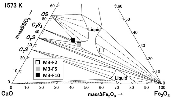 As shown in Table 5, for quaternary samples M3-F2, M3-F5, and M3-F10, the major components of the liquid phase were CaO, SiO2, and Fe2O3. In Figure 14, the liquid compositions were projected on the isothermal section of the CaO-SiO2-Fe2O3 ternary phase diagram at 1573 K [36] (Plate 10). Although the compositions were slightly scattered, they were located near the liquid region with the middle range of Fe2O3 content, in which the liquid boundary partly faced CS. So, one can consider that the solid CS phase would be dissolved to form liquid slag coexisting with CS, as in CaO-SiO2-Fe2O3 ternary phase diagram, through the addition of Fe2O3, as in the case with Al2O3 addition. Such consideration would be reasonable, again based on the compositional change.