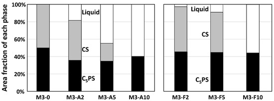In Figure 16, the area fraction of each phase that appeared in the SEM image is shown for Al2O3-containing samples and Fe2O3-containing samples, respectively. The value of the area fraction of each phase is an average of the plural image analysis. With the addition of the fourth components, the area fraction of the liquid phase increased, and that of C5PS decreased. For M3-A5 and M3-A10, the area fraction of CS drastically decreased and even disappeared. The area fraction of C5PS in M3-A10 was slightly higher than that of M3-A5, due to the incorporation of Al2O3 in C5PS at a higher Al2O3 content in the bulk composition, as shown in Table 4, over some variations of the analyzed data. With respect to the Fe2O3-containing samples, the liquid phase also increased with the addition of Fe2O3. Comparing the results of the same content of Al2O3 or Fe2O3, the area fraction of the liquid phase was relatively larger for Al2O3 addition.