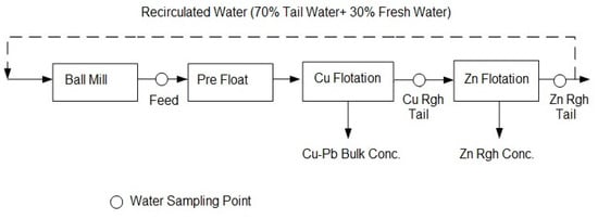 Water quality for flotation on a mine site can change substantially over time [1,2,3]. The composition of flotation water depends on the ore being processed, the reagents, the water source, and the way the site water system is managed. Variation in water quality is undesirable because it could complicate operating conditions and compromise flotation performance [4,5,6,7,8]. Hence, the quality of water should be maintained at a distinct level and the fluctuations should be prevented. In this case, usually freshwater is fed to the concentration plants to maintain a certain level of pollution. However, this increases freshwater consumption and may cause process water discharge without any treatment. A number of research works have focused on the reuse of tailing water in flotation circuits to minimize freshwater consumption [8,9]. On the other hand, the chemistry of the system may change by water recirculation due to the accumulation of various inorganic and organic species that affect process efficiency in different ways.
