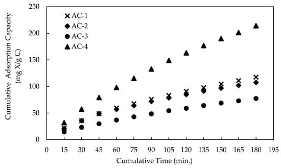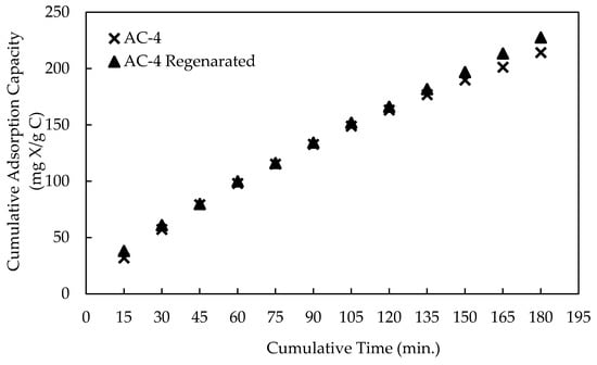 Activated carbon has a certain adsorption capacity. As more components are adsorbed on its surface, the adsorption capacity decreases over time. Once the maximum adsorption capacity is reached, it can no longer be effectively used. For the regeneration of activated carbon samples, adsorbed components can be destroyed by heating. In this part of the study, the spent activated carbon sample (AC-4) which adsorbed 214 mg of xanthate on its surface (Section 3.1.1) was regenerated by heating at 550 °C for 1 h. Adsorption performance of the fresh and regenerated carbon samples was compared in Figure 3. The cumulative adsorbed xanthate was 228 mg with the regenerated AC-4 and 214 mg with the fresh AC-4 sample. The results showed that the adsorbed xanthate on spent activated carbon was destroyed, it was restored efficiently and ready for reuse.