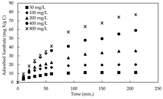 Adsorption of xanthate with varying contact times (10−210 min) and initial concentrations (50−800 mg/L) are shown in Figure 4. The amount of xanthate adsorbed on the activated carbon increased with an increase in agitation time and then reached a maximum value. In the first 60 min, the adsorption was fast as the binding process between xanthate and the adsorption sites of the activated carbon were totally and efficiently completed. After 60 min, the adsorption process was slower due to the saturation of active sites of the carbon [24].