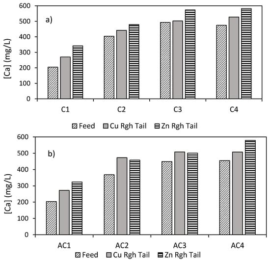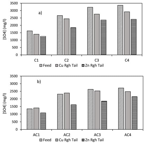 Variations in the sulfate concentration during flotation tests are given in Figure 6. The sulfate concentration in the tap water was 20 mg/L (Table 3) and increased to 1624.8 mg/L in the feed water of the first cycle (Figure 6a) due to the oxidation/dissolution of the sulfide minerals during the grinding stage. In the following copper and zinc rougher flotation stages the sulfate concentration decreased to 1400 mg/L and 1257 mg/L, respectively. The sulfate concentration was lower in the zinc flotation stage despite addition of CuSO4 for sphalerite activation. This could be attributed to the precipitation of sulfate at high pH values with the addition of lime in the zinc flotation stage [30]. Sulfate concentration increased considerably in cycle 2 with water circulation. Stable water chemistry conditions were observed in cycle 3 and cycle 4. A similar trend was observed with the tests performed with water treatment. There were small differences in sulfate concentrations between the tests conducted using non-treated (Figure 6a) and treated (Figure 6b) water.