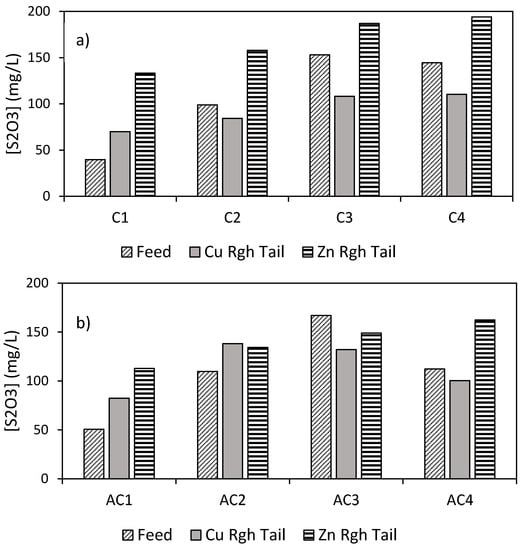 Thiosulfate ions are produced during grinding and flotation of sulfide minerals due to the oxidation of the sulfide group at about pH 9 [31]. Approximately 39.7 mg/L thiosulfate entered the flotation feed water during the grinding stage and increased to 144.6 mg/L at the end of Cycle 4 (Figure 7a). The amount of thiosulfate at the end of Zn rougher flotation stage was slightly higher than the other stages (Figure 7a). However, there was no clear trend between the flotation stages in the tests with water treatment (Figure 7b). The thiosulfate ions are generally oxidized to sulfate during flotation depending on the flotation chemistry and time. The small differences between each cycle might resulted in the fluctuated thiosulfate concentrations.