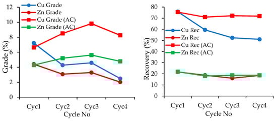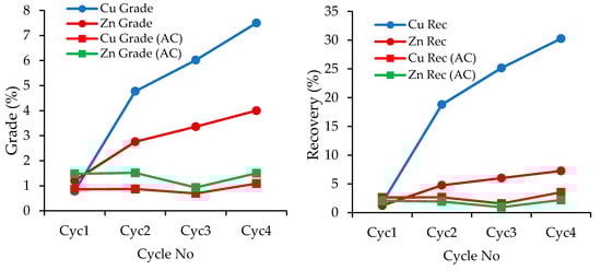 Figure 10 shows Cu and Zn grades and recoveries in pre-flotation concentrate for the tests with and without water treatment using activated carbon (AC). The copper grade and recovery were significantly higher with the test performed without water treatment. While the copper recovery increased from about 2% in cycle 1 up to 25% in cycle 4, the copper grade increased from 0.77% to 7.49%. A similar trend can be seen for the zinc recovered to the pre-float product, at a much lower rate. This was attributed to the presence of residual xanthate ions in the circulated water. Residual xanthates and their oxidation products in process water could absorb on sulfide minerals and reduce selectivity in the pre-flotation section where the naturally floatable gangue minerals are removed from the pulp [32]. After water treatment, the copper grade and recovery decreased to about 0.8% and 2% respectively in all cycles.