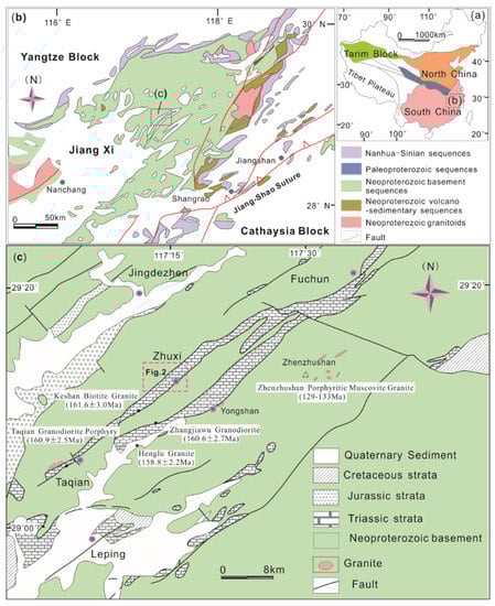 Figure 1. Geological map of the Jingdezhen area of the South China Block. (a) Inset shows the location of the South China Block. (b) Sketch tectonic map of the Jingdezhen and adjacent areas (modified from [34]). (c) Geological map of the Zhuxi area (modified from the [35]).