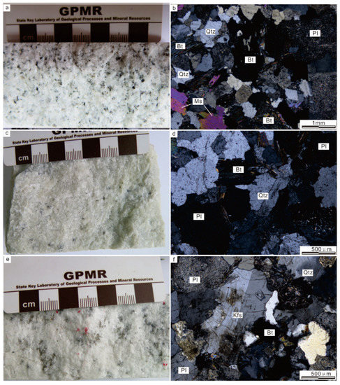 Figure 3. Hand specimen views and photomicrographs of granites in the Jingdezhen area: (a,b) two-mica granite; (c,d) biotite granite; (e,f) granodiorite. Abbreviations: Qtz—quartz; Bt—biotite; Ms—muscovite; Pl—plagioclase; Kfs—Kfeldspar.