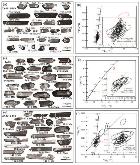 Zircons with oscillatory zoning from samples Zk4212–289, Tw13, and Zk4212–582 were selected for 206Pb/238U dating (Figure 4). For sample Zk4212–289, 27 ablation spots gave concordant results (within error), with a weighted–mean age of 159 ± 1 Ma (MSWD = 2.10) (Figure 4a,b); 11 analyses of Tw13 yielded a weighted mean age of 147 ± 2 Ma (MSWD = 4.80), with a further seven showing older ages and interpreted as being xenocrysts (Figure 4c,e); 19 analyses of Zk4212–582 yielded a weighted mean age of 147 ± 1 Ma (MSWD = 2.00) (Figure 4e,f).