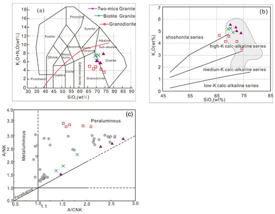 Figure 5. (a) Total alkali-silica (TAS) diagram (after [61,62]; (b) K2O–SiO2 diagram (after [63]) and (c) A/NK–A/CNK diagram (after [64]) for the Zhuxi granites from the Jingdezhen area. The shaded area in (b) and circles in (c) denote published data for the Zhuxi granites [38,42,43].