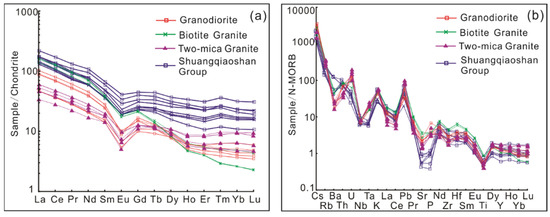 Figure 6. (a) Chondrite-normalized REE and (b) N–MORB-normalized trace-element spider patterns of the Zhuxi granites and Shuangqiaoshan Group (normalizing factors are from [65]; E–MORB, OIB, and N–MORB compositions are from [66]).