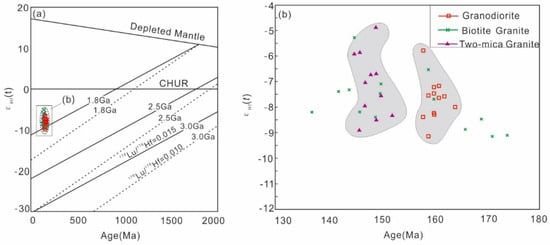 In the present study, the early-stage granodiorite yielded a zircon U–Pb age of 159 ± 1 Ma, and the late-stage two-mica granite and biotite granite yielded ages of 147 ± 2 and 147 ± 1 Ma, respectively. The granodiorite age of 159 ± 1 Ma is consistent with the widespread Middle Jurassic magmatic rocks of the Zhuxi area [42,88,89]. The ages of the two-mica granites and biotite granites are consistent with those of previous studies and represent the second stage of Yanshanian magmatism. This indicates that magmatic processes in the Zhuxi granites proceeded for at least 10 Ma during the Middle-Late Jurassic. The pluton contained two sequences of granodiorite and two-mica biotite granite. Geochemical characteristics and isotopic data indicated that these granites display similar magma evolutionary trends, having undergone multi-stage magma evolution, and are the result of homologous magmatic differentiation [36,38,43]. Furthermore, the ages of lamprophyre veins in the Zhuxi area are ~160 Ma [88]. The zircon Hf isotopic composition of the lamprophyre indicates it was contaminated by crustal components, but the genetic relationship between the granites and the lamprophyre remains unclear [88,90].