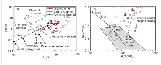 The Zhuxi granites had relatively high Rb/Ba and Rb/Sr ratios, implying an affinity with pelite-derived melt, and all samples plot in the clay-rich field in the Rb/Ba vs. Rb/Sr diagram, indicating a plagioclase fractionation trend (Figure 8a) [80]. In the CaO/Na2O–Al2O3/TiO2 diagram (Figure 8b), the Zhuxi granites displayed varied CaO/Na2O ratios. Considering the Na2O have a negative relationship with LOI, the decrease of Na2O caused by alteration causes the increase of CaO/Na2O, so the spots should plot in the pelite–derived melt field, further indicating magma was derived from partial melting of the pelite rocks.