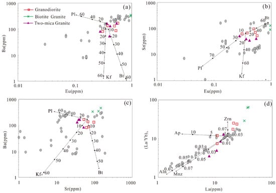 Figure 9. (a) Ba vs. Eu, (b) Sr vs. Eu, (c) Ba vs. Sr, and (d) (La/Yb)N vs. La diagrams of the Zhuxi granites. Partition coefficients of Ba and Sr are from [82], Eu is from [83], apatite is from [84], zircon and allanite are from [85], and monazite is from [86]. Abbreviations: Pl—plagioclase; Kf—K–feldspar; Bt—biotite; Aln—allanite; Mnz—monazite; Ap—apatite; Zrn—zircon.