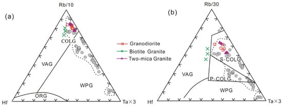 Figure 10. Tectonic discrimination diagrams for Zhuxi granites of the Jingdezhen area. (a) Rb/10–Hf–(3Ta); (b) Rb/30–Hf–(3Ta) (after [107]). VAG—volcanic arc granite; WPG—within–plate granite; ORG—oceanic ridge granite; COLG—collisional granite; S–COLG—syn–collisional granite; L–COLG—late–collisional granite; P–COLG—post-collisional granite. The circles in the diagrams denote published data for the Zhuxi granites [38,42,43].