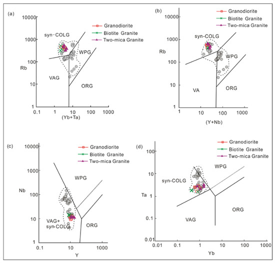In the Hf–(Rb/10)–(3Ta) tectonic discrimination diagram (Figure 10a; [107]), the Jingdezhen samples plot in the field of collisional granites (COLG), while in the Hf–(Rb/30)–(3Ta) diagram (Figure 10b) the two-mica granites and granodiorites plot in the syn-collisional granitoid (S–COLG) field. The granodiorites also plot in the overlapping field of volcanic arc granitoid (VAG) and S–COLG. In Rb–(Yb + Ta), Rb–(Y + Nb), and Ta–Yb tectonic discrimination diagrams, all the samples plot in the S–COLG field (Figure 11a,b,d). In the Nb–Y discrimination diagram, the samples plot in the S–COLG and VAG fields (Figure 11c; [108]). In all these tectonic discrimination diagrams, most samples plot in the syn-collisional field and some plot in the collisional field (Figure 10 and Figure 11).